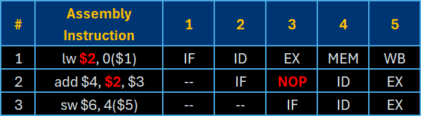 This example shows an ADD instruction that requires a value not available until the MEM stage of the preceding LW instruction. The processor implements the NOP in stage 3 to push the ADD instruction’s access to its ID stage in the following stage.