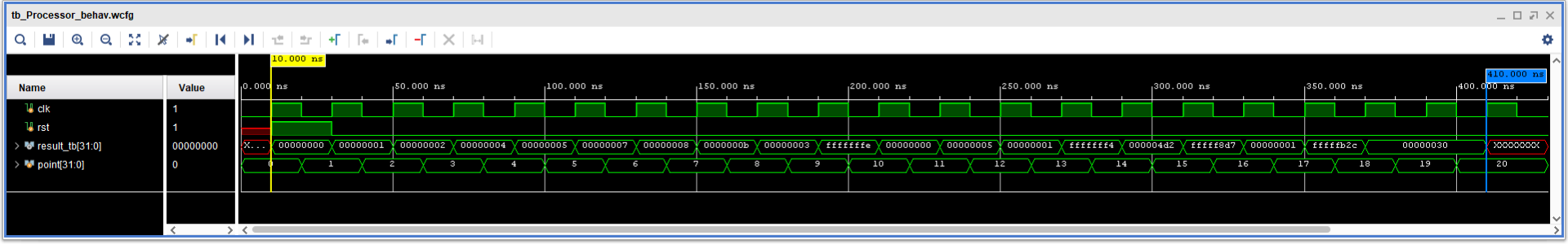 To test the final design, I developed the tb_Processor.v test bench that processes a series of 20 instructions, evaluating the accuracy of each.